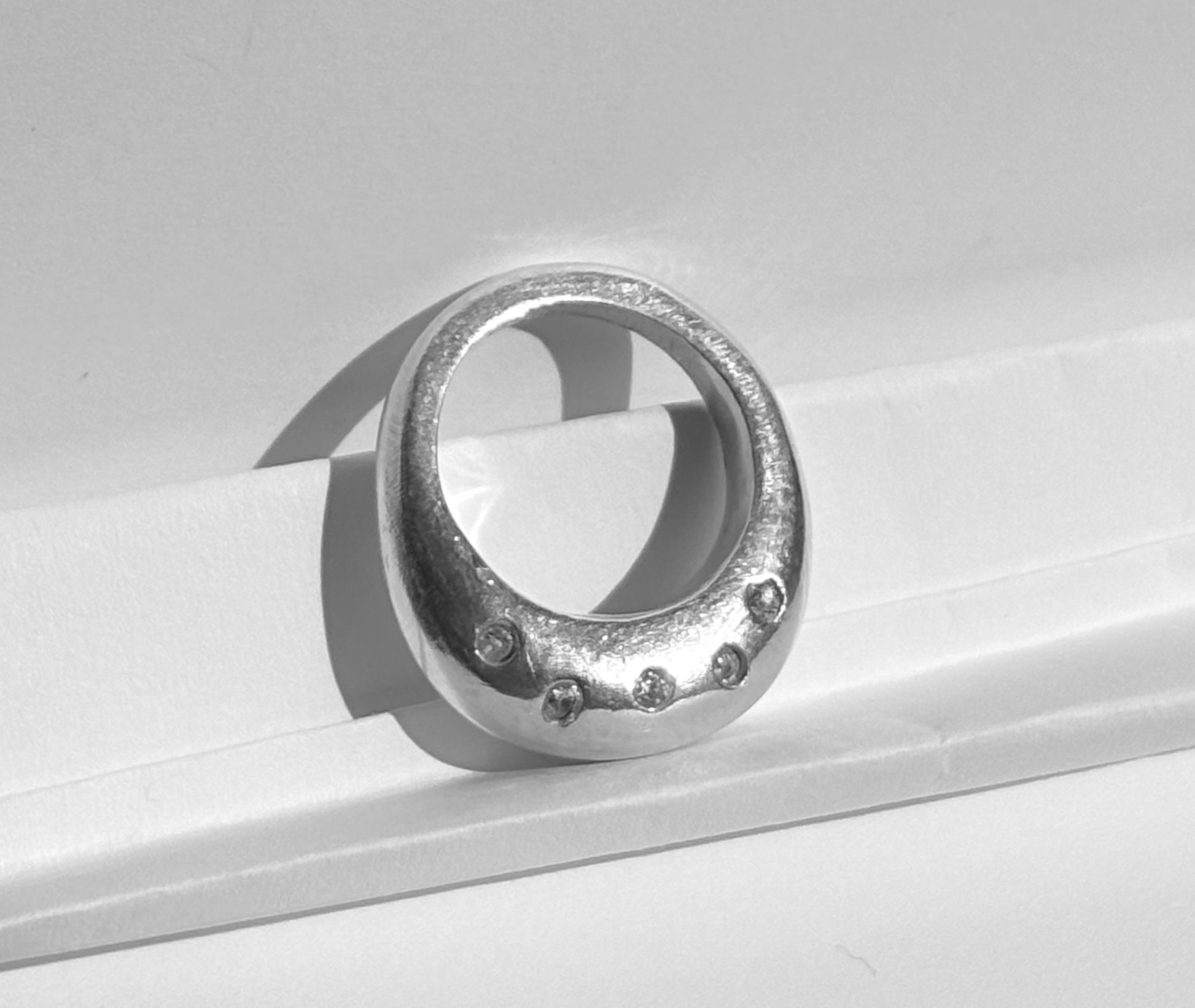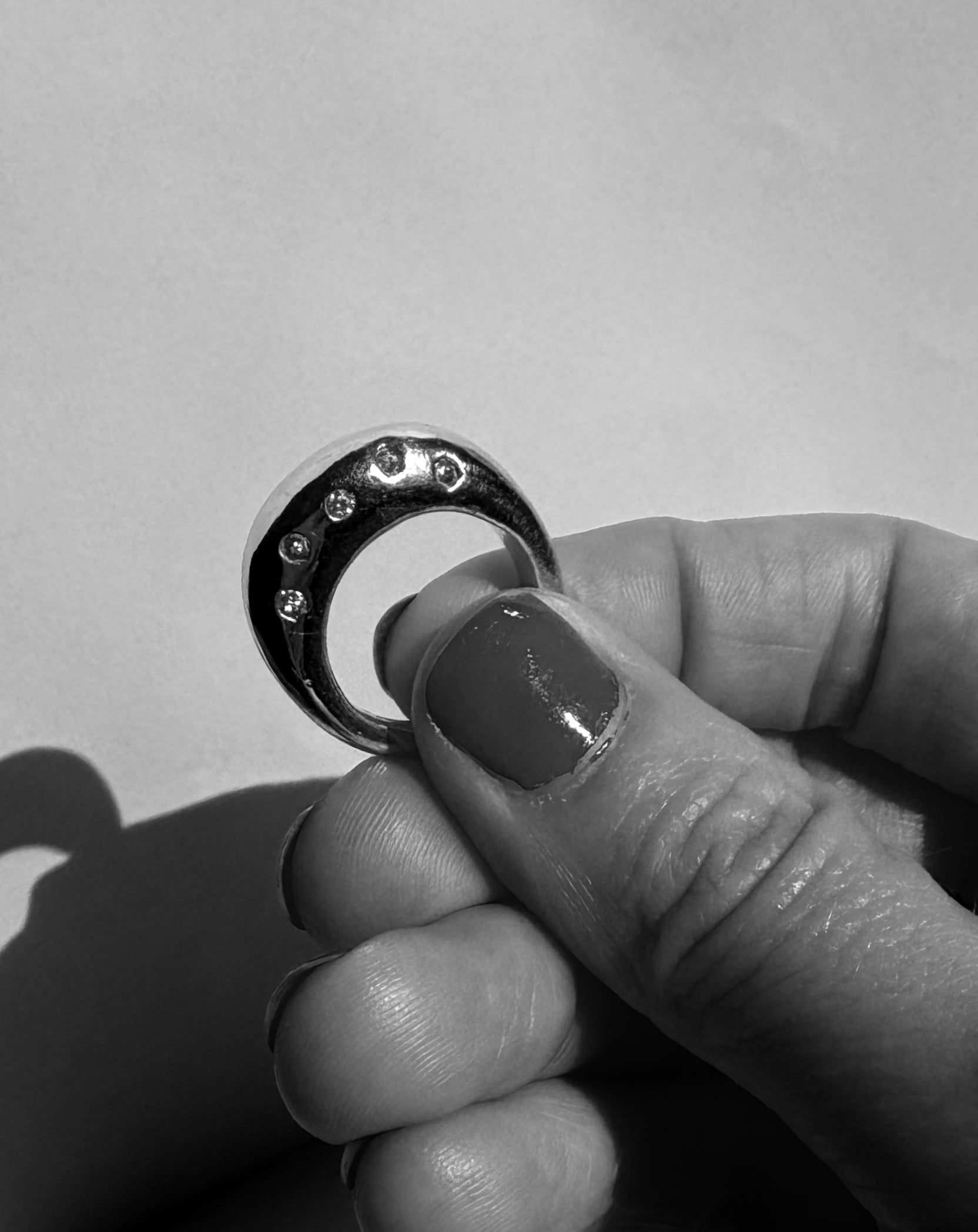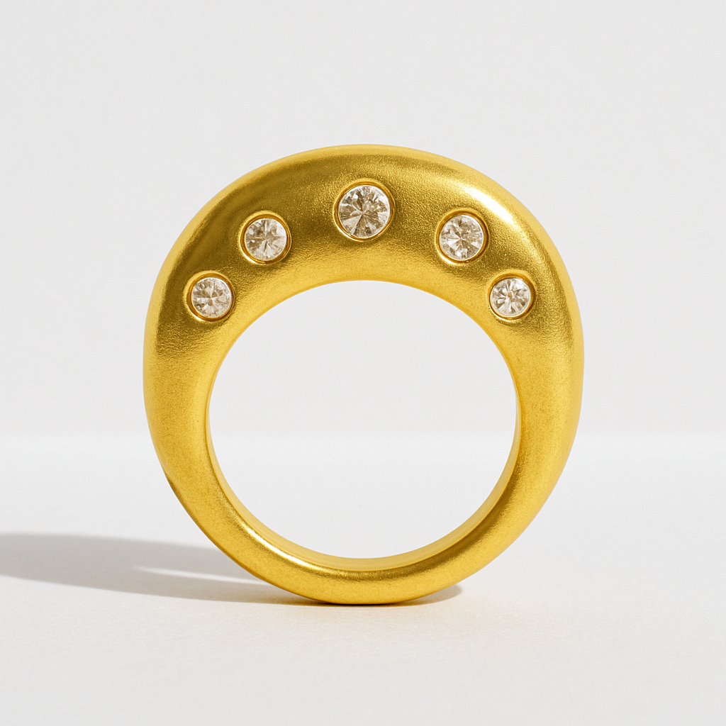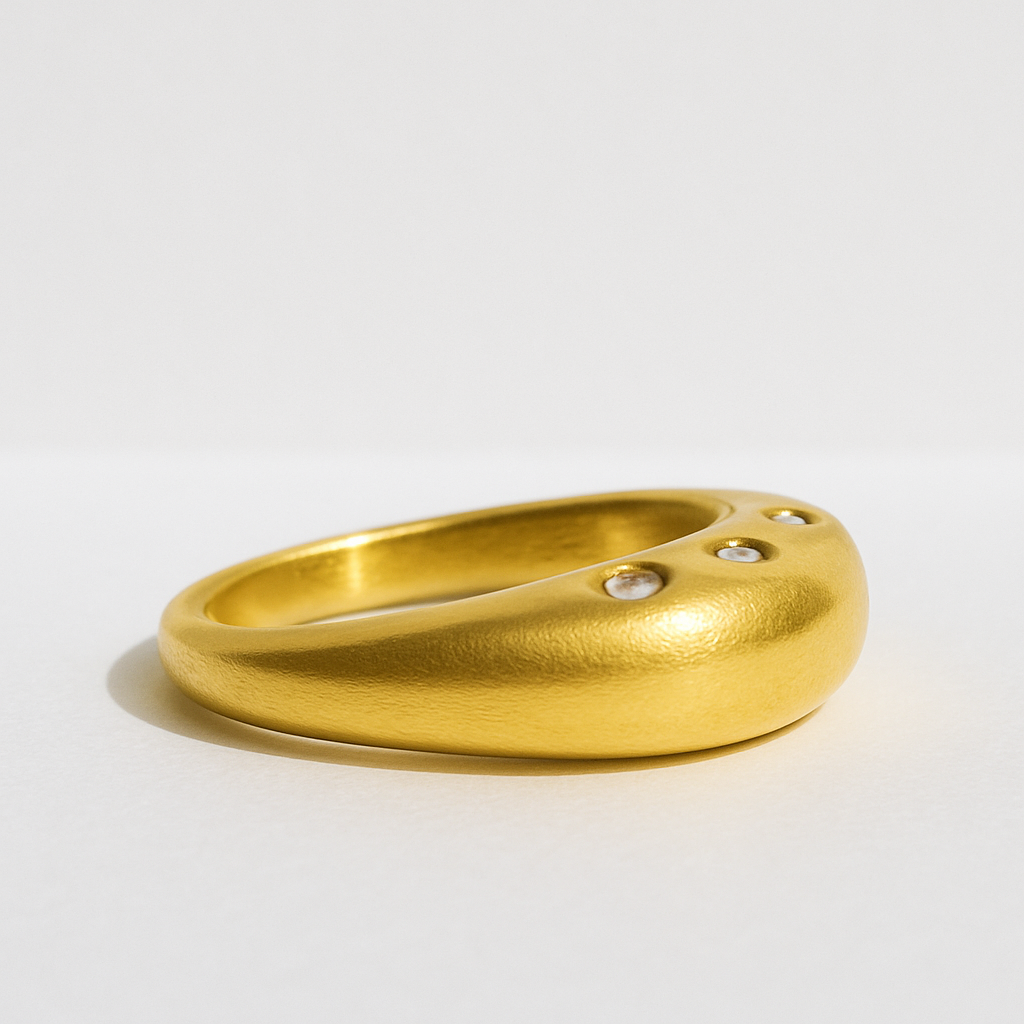 Designed with quiet elegance in mind, the Peek-A-Boo ring features five 1.5-2mm flush-set white sapphires nestled along the inner curve of a softly domed band. From the top, it appears minimal and unassuming—but tilt your hand, and a subtle flash of brilliance is revealed. This hidden detail makes the Peek-A-Boo ring feel like a personal treasure, meant to be discovered in a glance or shared with intention.