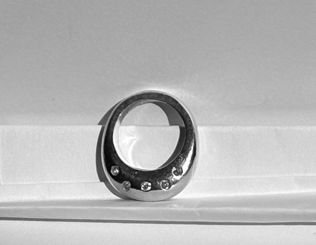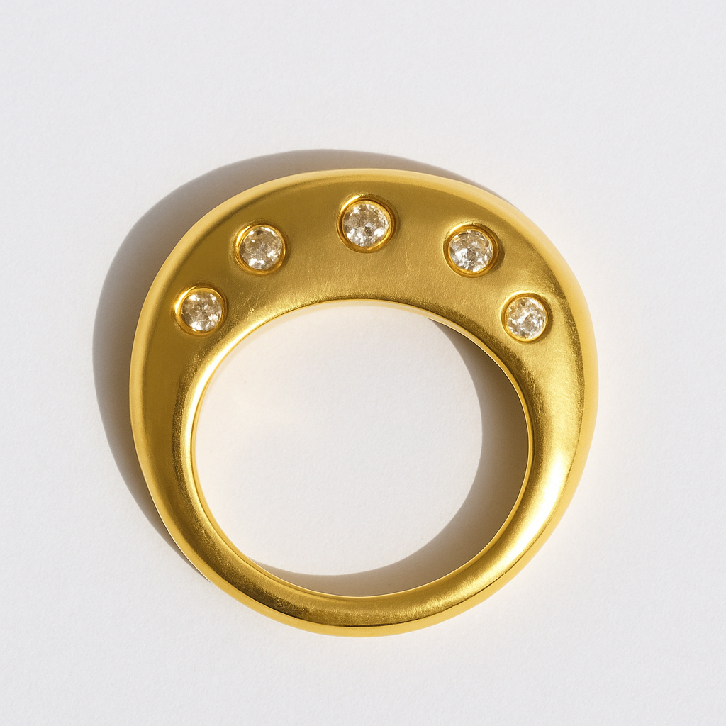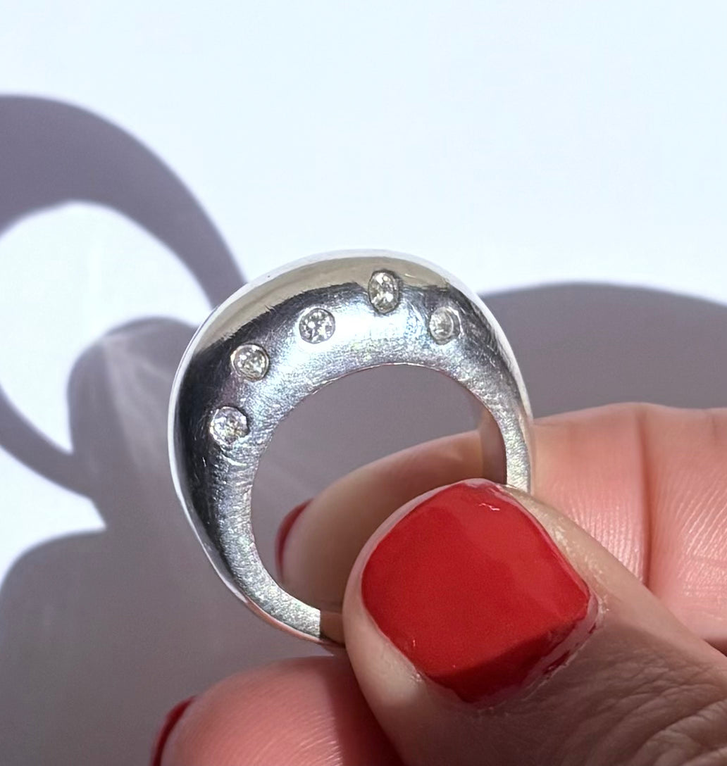 Designed with quiet elegance in mind, the Peek-A-Boo ring features five 1.5-2mm flush-set white sapphires nestled along the inner curve of a softly domed band. From the top, it appears minimal and unassuming—but tilt your hand, and a subtle flash of brilliance is revealed. This hidden detail makes the Peek-A-Boo ring feel like a personal treasure, meant to be discovered in a glance or shared with intention.