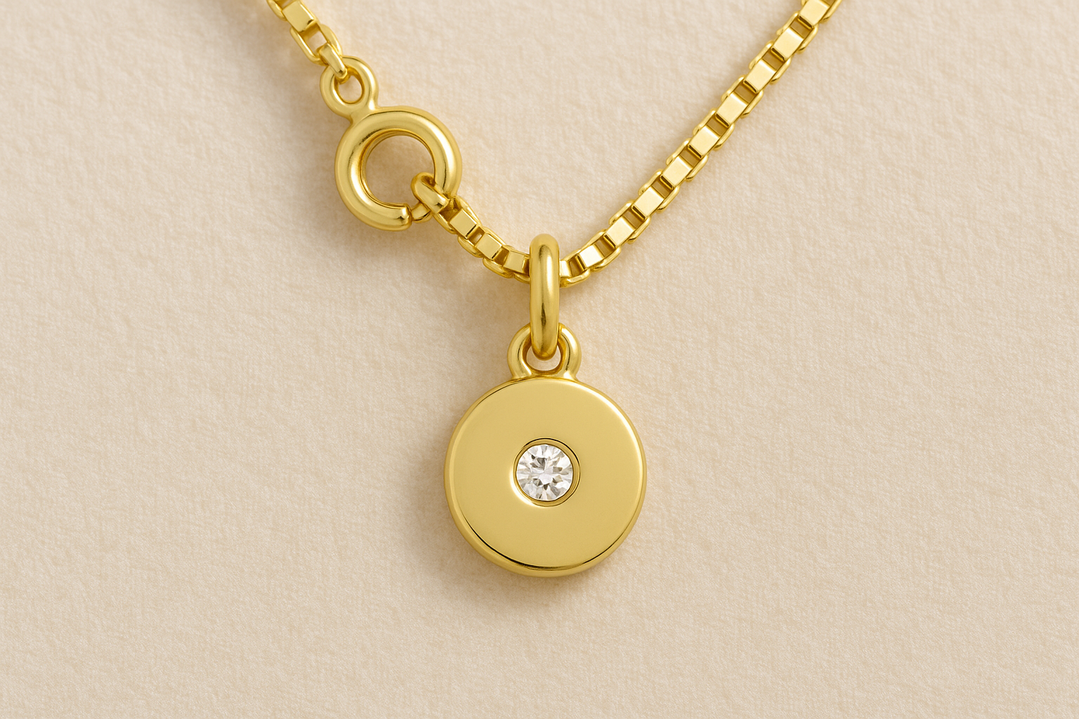 A delicate symbol of clarity, power, and protection — the Sol Disc Necklace is your everyday luxury. Crafted in your choice of precious metal, this minimalist charm features a brilliant VS2/G-color diamond bezel-set into a polished golden disc, suspended from a sleek 0.8mm box chain.