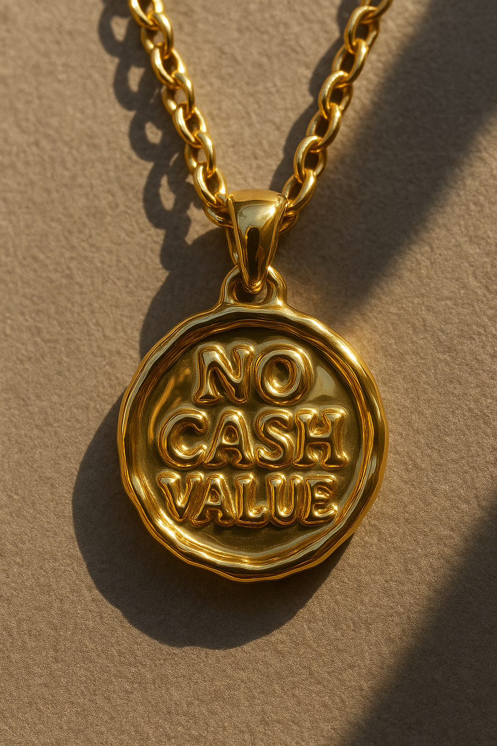 In a world where gold is soaring—around $3,580 per ounce (about $115 per gram) as of today—this pendant cheekily declares “NO CASH VALUE.” It’s an irony you can wear: a molten, hand-carved disc shaped by the lost wax method, high-polished and engraved with bold clarity, reminding us that the most precious things often cost far less than their monetary worth.